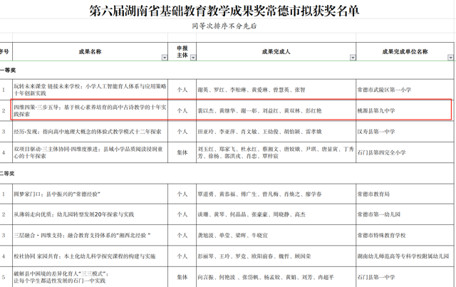 近日,第六届湖南省基础教育教学成果奖评选结果揭晓。桃源县第九中学正高级三级教师、特级教师裴...